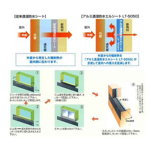 「アルミ透湿防水エルシート LT-5050」は日射で温められた外壁から放射される輻射熱を軽減するために開発された新しいタイプの遮熱型透湿防水シートです。
