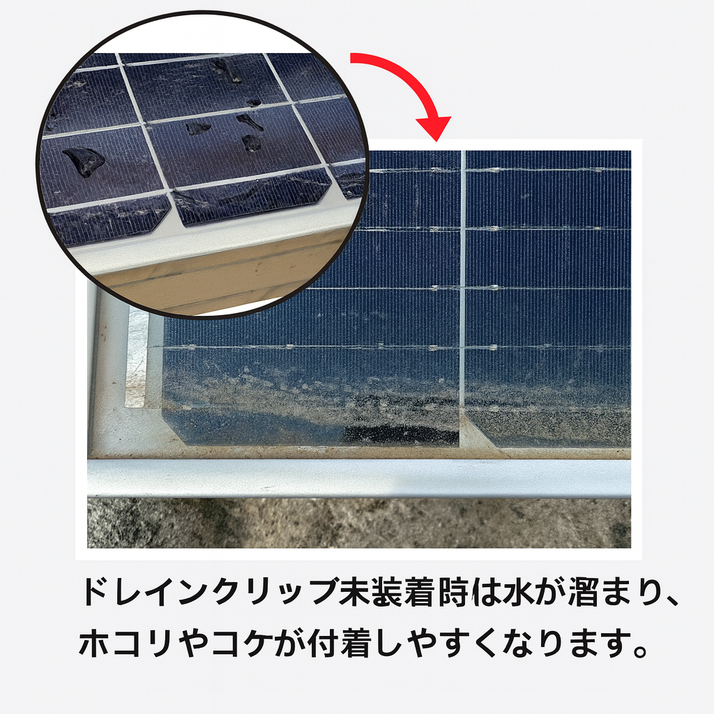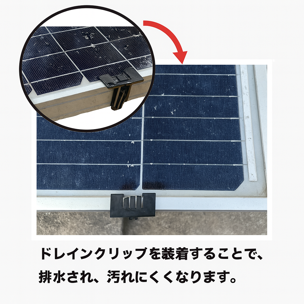 ソーラーパネルの端部に溜まる水を排水し汚れにくくします