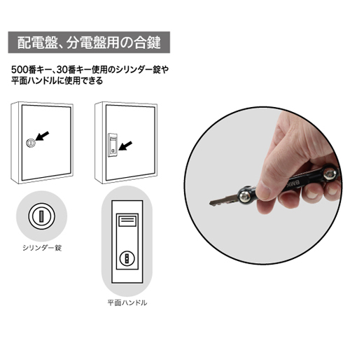 6タイプのカギに対応した配電盤、分電盤用の合カギ。